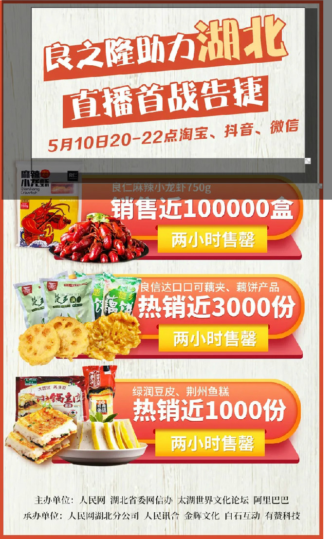 幻影app最新版下载助力湖北重振,首战取得开门红!来自幻影app最新版下载的良仁麻辣小龙虾销售近100000盒;良信达口口可藕夹、藕饼产品热销近3000份;绿润豆皮、荆州鱼糕热销近1000份