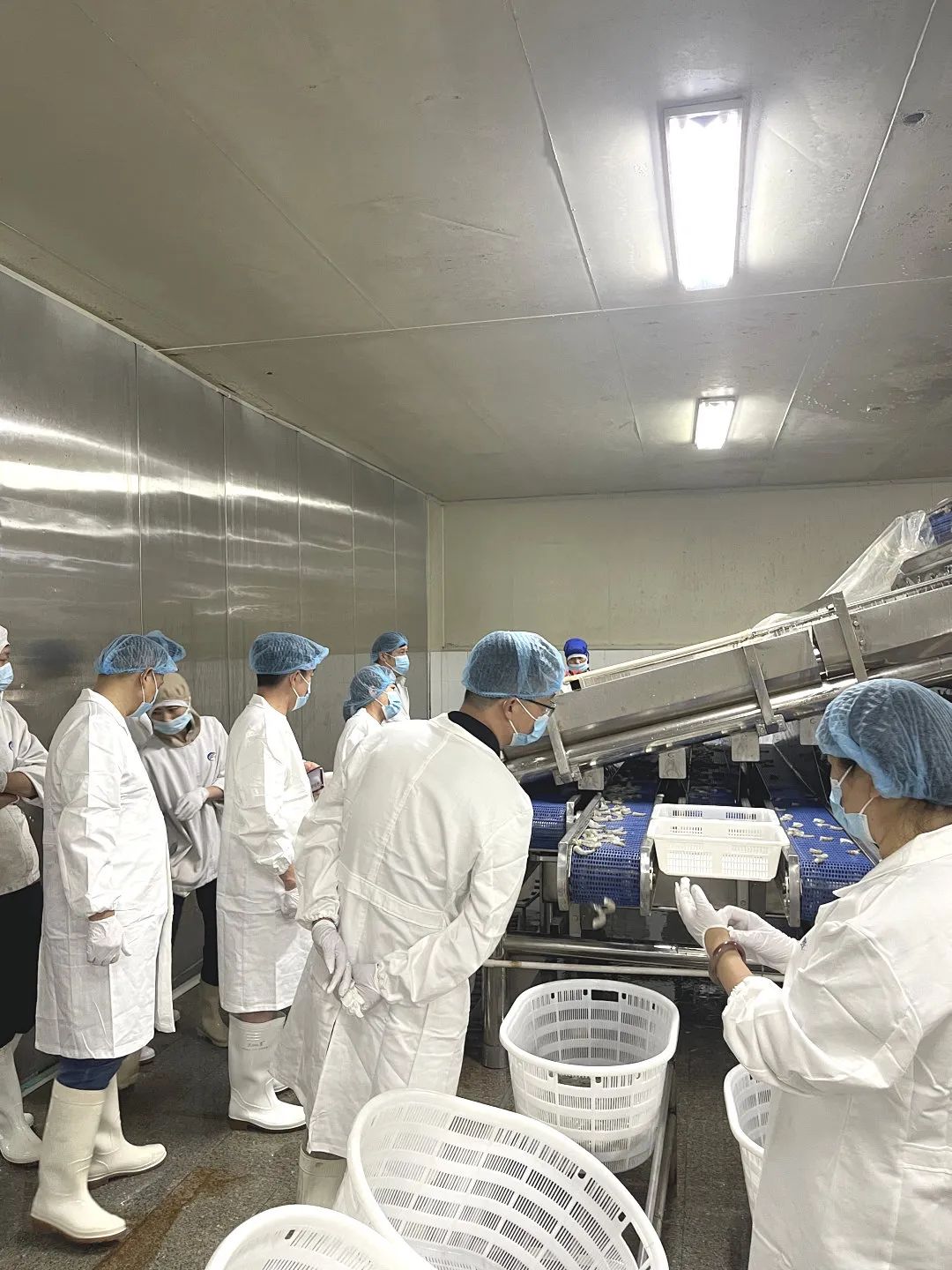 在工作人员的引领下,考察团近距离参观了车间的整个加工流程,对一只只鲜活的虾如何变成一份晶莹剔透的虾仁有了更深入的了解。完整的虾仁生产线、先进的设备给考察团一行留下了深刻印象。